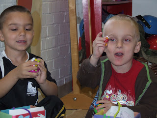 Yes, we successfully had our class Easter egg hunt in the church narthex and boy were Mrs. Julie & proud. All 15 of us (we had one absent) found our eggs with minimal assistance, if any. It was so much fun to see them carefully review each egg and make a decision about whether or not it contained their own personal information. They Did Great!!!!! Of course, they were motivated by treats and treasures and really enjoyed opening their eggs. Look at their faces, it is excitement plus pride. We also were very proud of their great behavior. Since our egg hunt was inside, we had to keep our voices down and hunt in a fairly "subdued" manner. These boys and girls are the best!!!!!