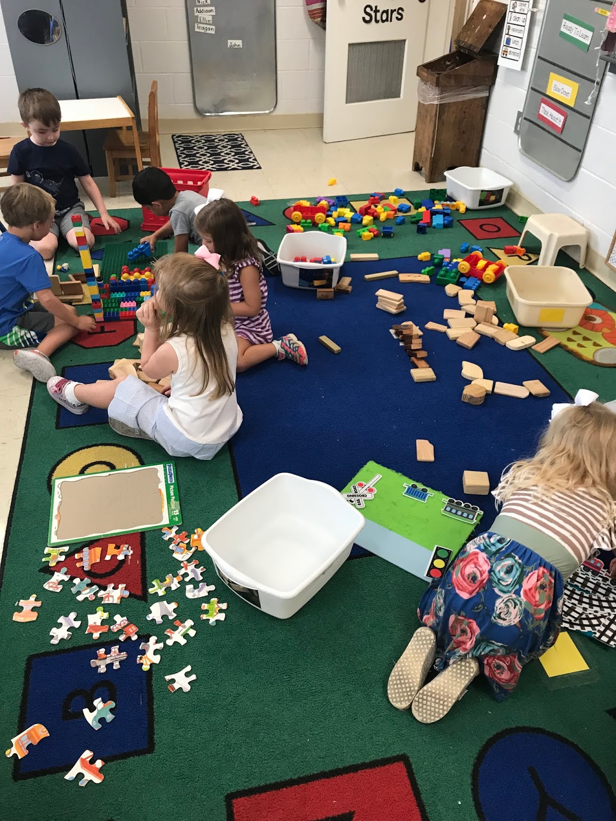 AND ended our day with our room looking like this!!!! The pictures below show what happens when you are playing and learning at the same time!!!! Somehow everything gets dumped out and then we all have as much fun cleaning it up!!!